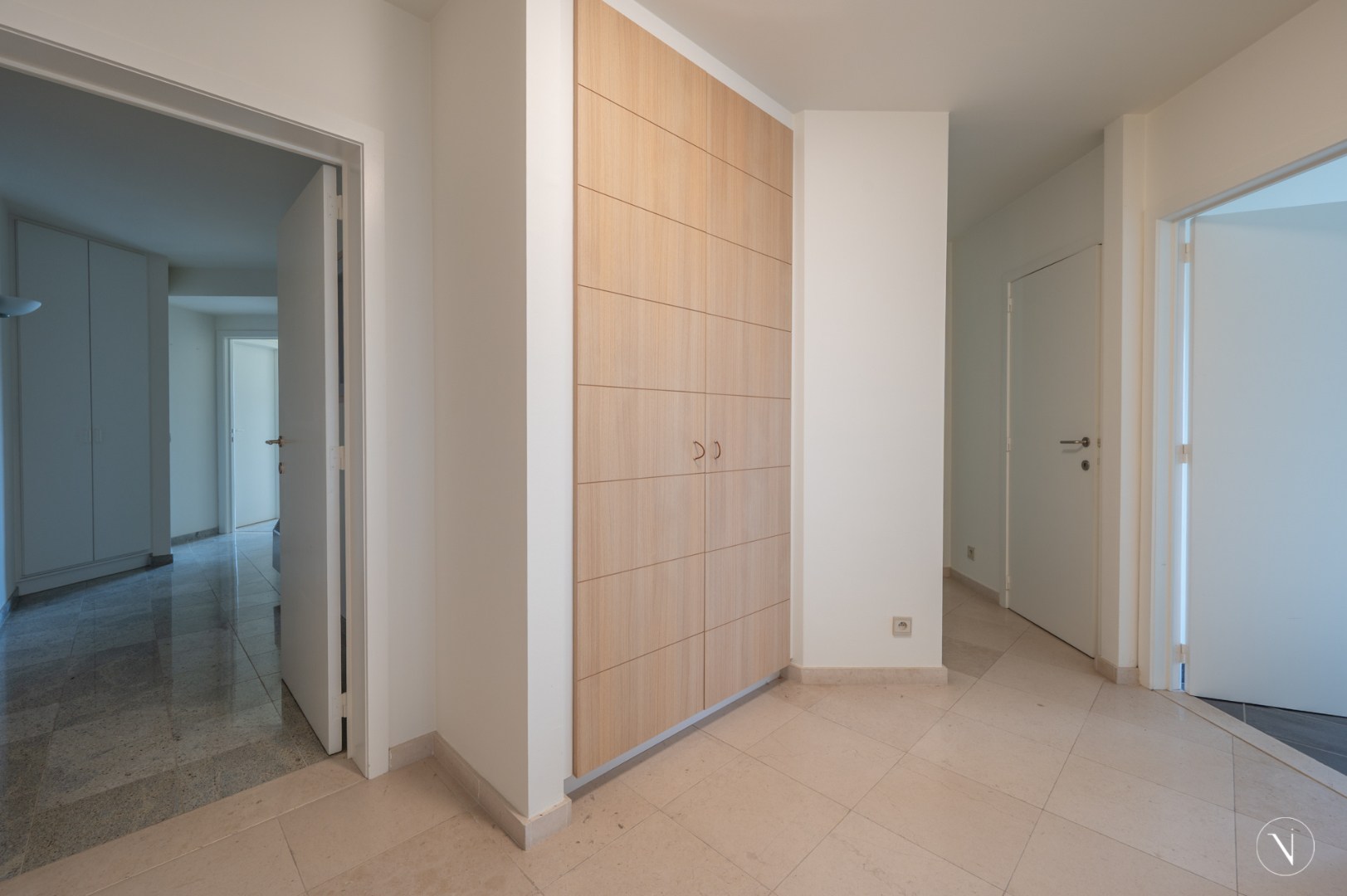Het appartement biedt een aangename en functionele indeling met een royale inkomhal voorzien van vestiaire en gastentoilet, een zeer ruime woonkamer met salon en eetplaats, een volledig ingerichte keuken, vier volwaardige slaapkamers en drie badkamers.