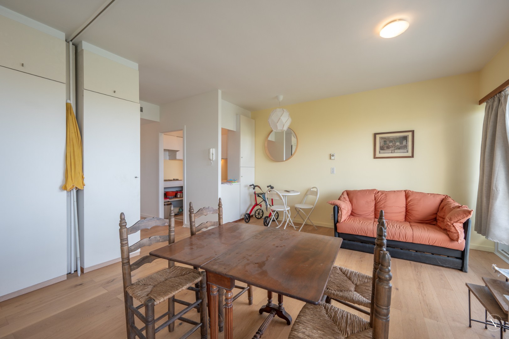 Studio 854 gelegen in residentie Laguna Beach te Duinbergen met panoramisch zicht over de polders. Indeling studio: Woonkamer, keuken, badkamer, toilet en terras.