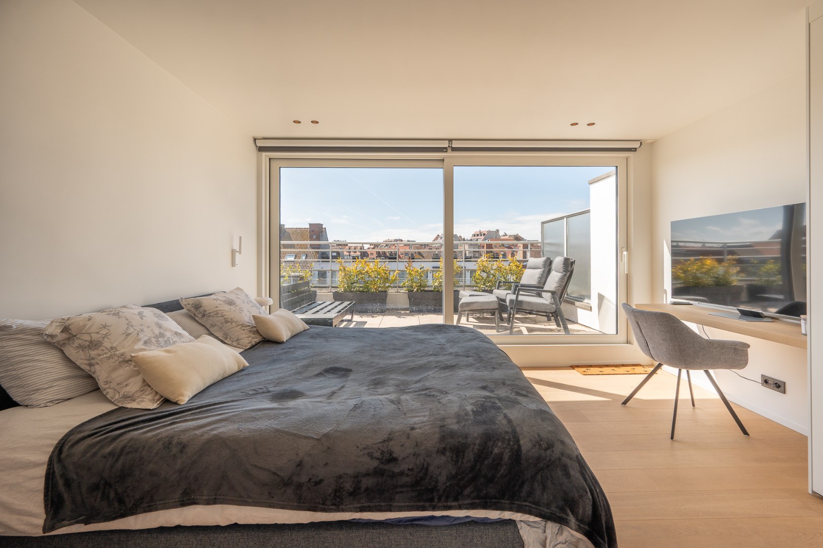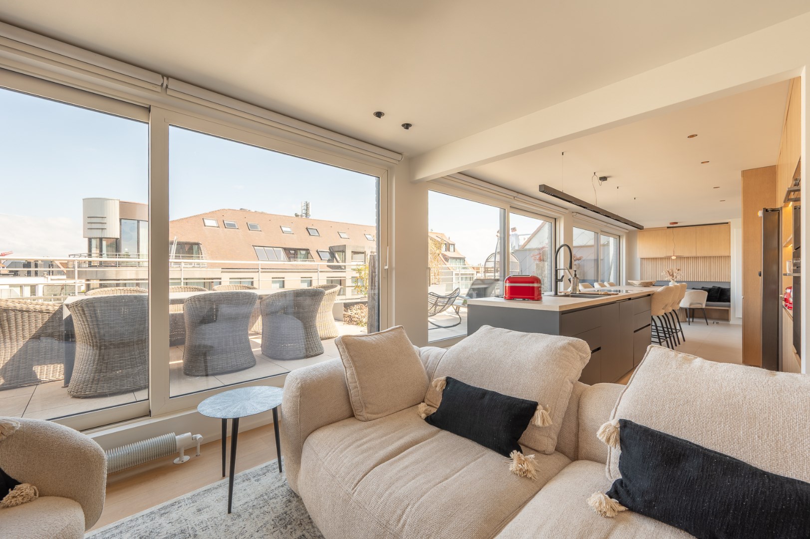 • Twee Ruime Dakterrassen: Geniet van de zon van 's ochtends tot 's avonds op het voorterras van 60 m² met een adembenemend uitzicht op de Lippenslaan en de zee, of ontspan op het achterterras van 40 m², voorzien van grote schuiframen en sierlijke beplanting.